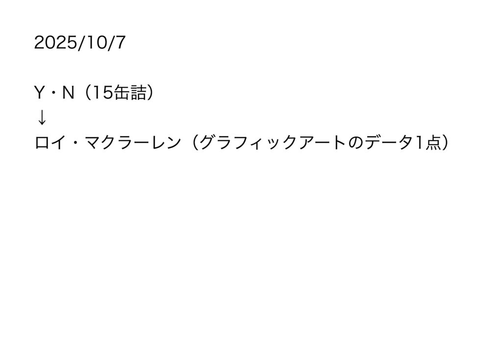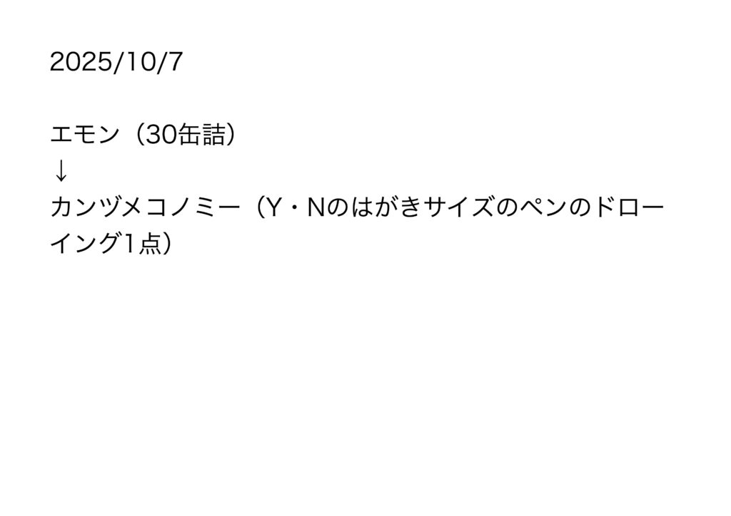 7.エモンは、カンヅメコノミーから30缶詰でY・Nのはがきサイズのドローイングを1点購入。