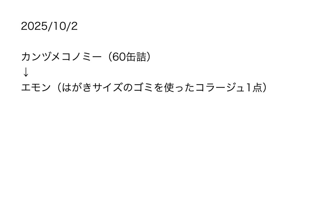1.カンヅメコノミーは、エモンから60缶詰ではがきサイズのゴミを使ったコラージュ1点を購入。