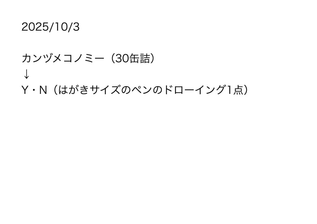 3.カンヅメコノミーは、Y・Nから30缶詰ではがきサイズのペンのドローイング1点を購入。