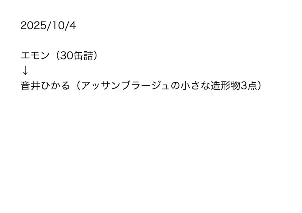5.エモンは、音井ひかるから30缶詰でアッサンブラージュの小さな造形物3点を購入。
