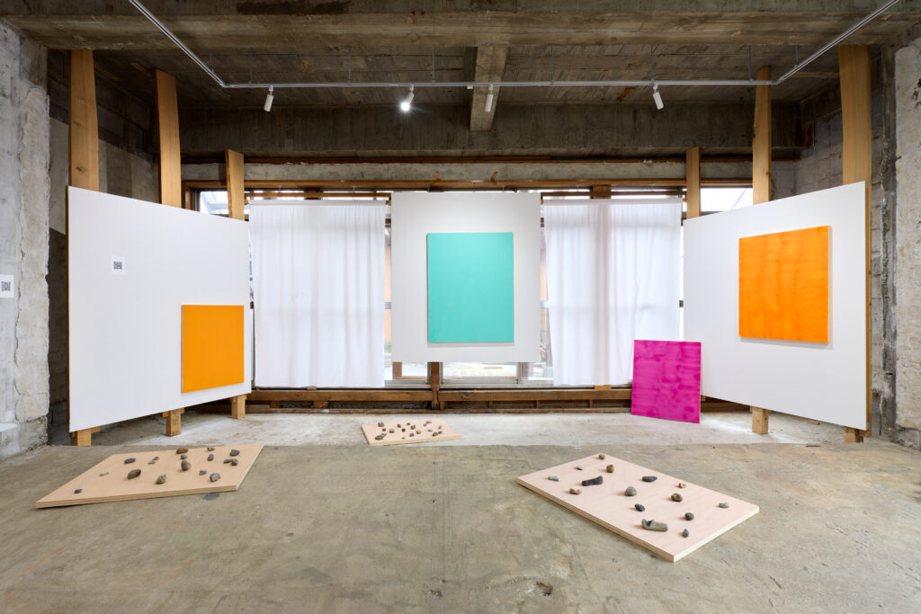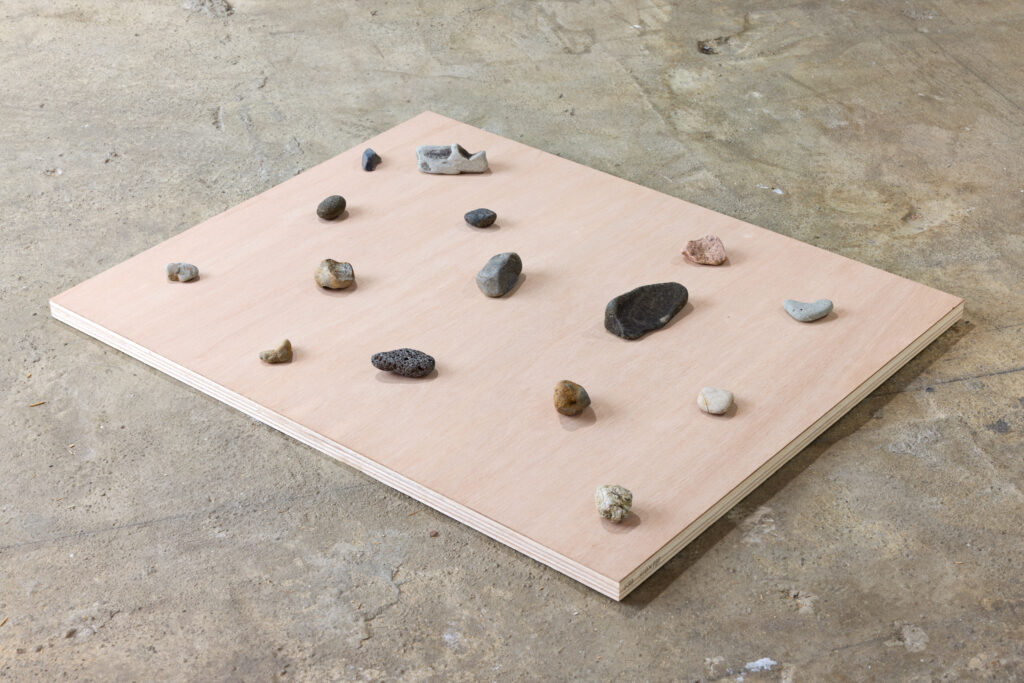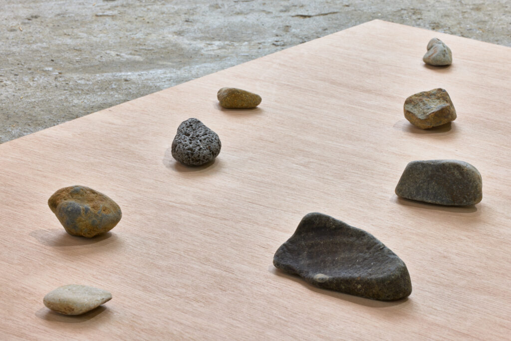 たしかにV字の切れ込みと細長い形が “革のスリッパ” のようだ。コンクリート打ちっぱなしの床には、同じように十数個ずつ石を載せた木製パネルがあと3枚点在していて、「自然の産物それ自体がアーティスト」に擬せられた【じにゃん】の作品でありつつ、石の1個1個が【じにゃん】の現れでもあるのだろう。
