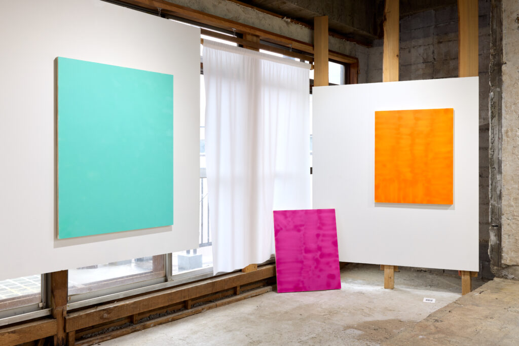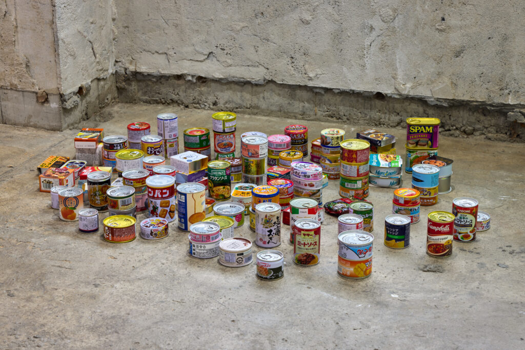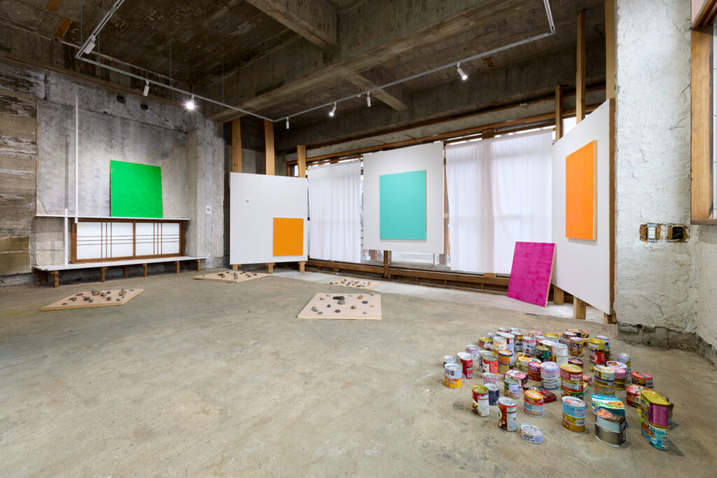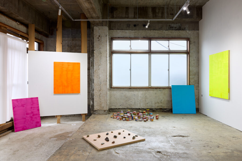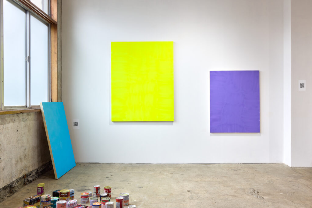 そして、窓辺にお店を広げるように置かれた、100個を超えるとおぼしき缶詰は定番の「カンパン」から変わり種の「たこ飯」までバラエティ豊かに取り揃えられているが、これは「食料。アーティスト。人類が食べることができる素材、もしくはそれらによる調理品(料理)」の【じゃじゃ】で、隣に立て掛けられているのは【ラネプ】なのだろう。「色彩。アーティスト。人間にとっては可視光線の波長の中に存在している」 “彼” の作品(であり存在そのもの)は、スプレーで一面単色に塗装されたパネルで、おそらく【じにゃん】のパネルと同型のものだ。目の前の、窓際に立て掛けられたものは水色、そこから時計回りにぐるりと見れば黄、紫、赤、黄緑、オレンジ、ミントグリーン、赤紫、赤橙のパネルが配されており、その表面には時に稲妻や、